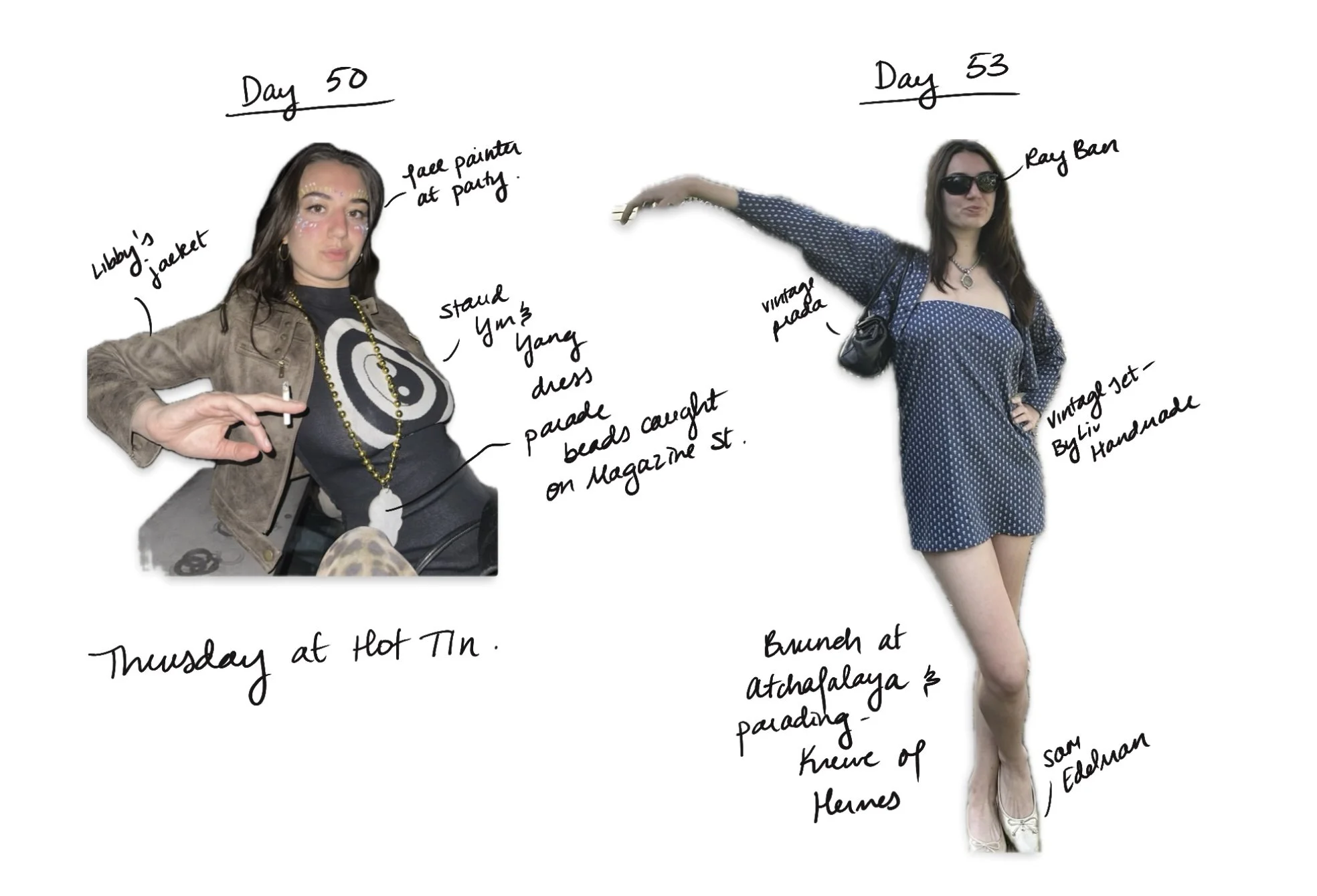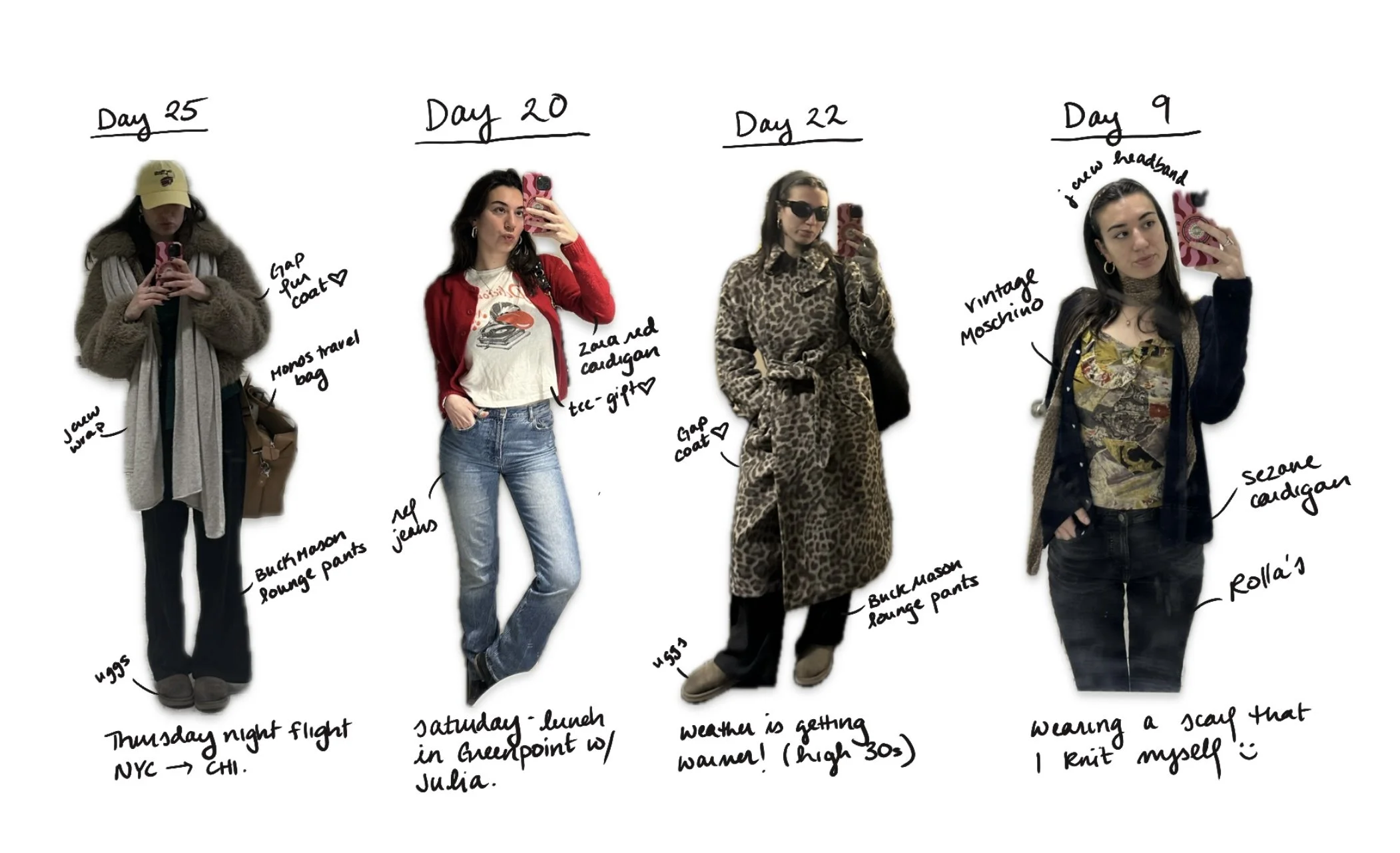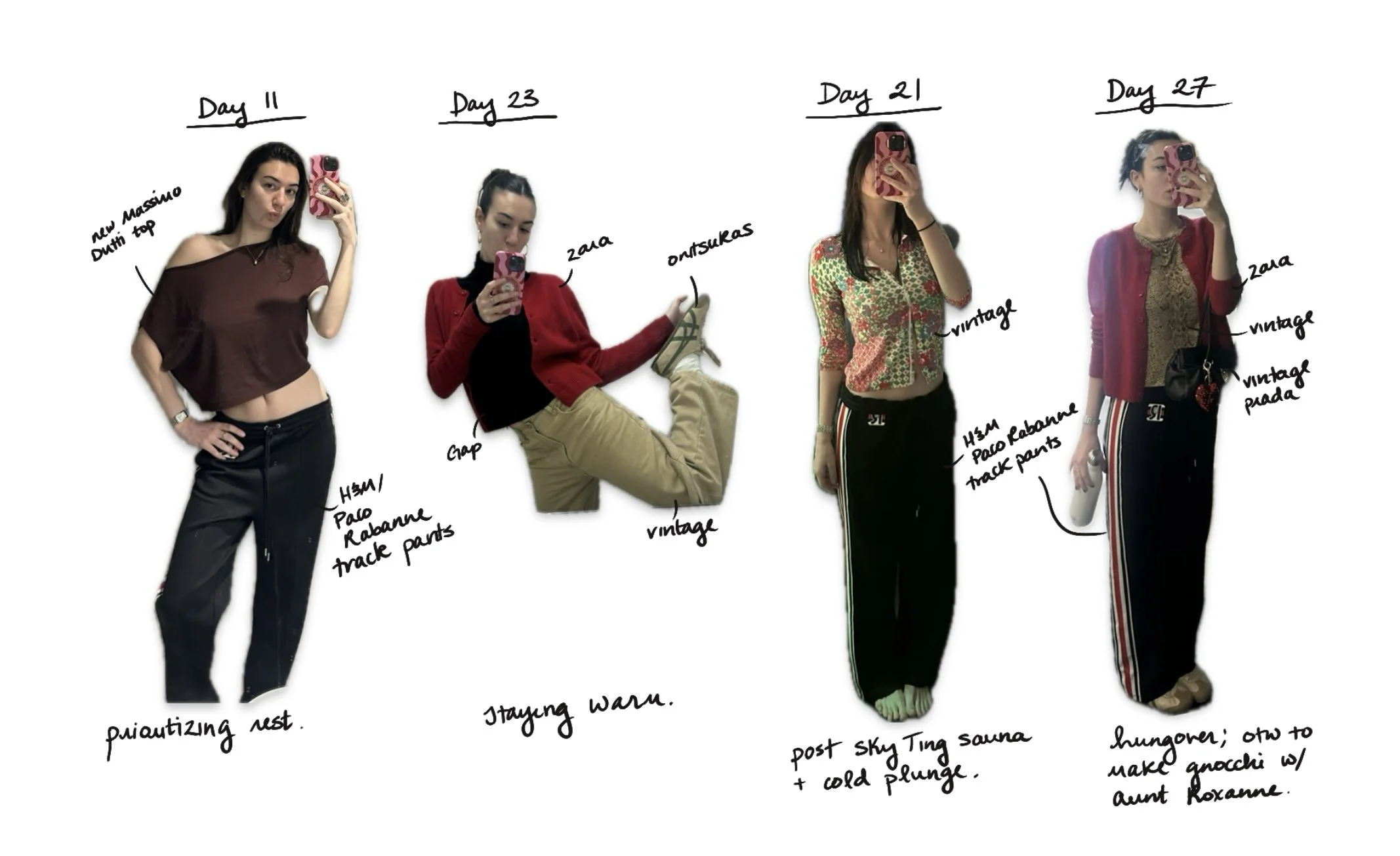 In addition to documenting each outfit, my tracker became somewhat of a diary as well. Below each photo was a short description, from “Made homemade gnocchi hungover with my Aunt,” to “Fainted on the NYC subway” to “Bakery run.” Not only does it show all my outfits, both the pajama days in bed and the party nights out, but it’s also a ruthlessly realistic description of the days that make up my life.